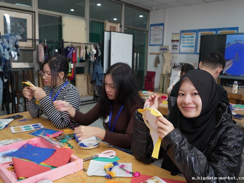 会后,研学团成员参观了校文化传承与创新中心和实训中心。参观过程中,泰国师生对服饰、皮具、手工艺品等表现出了浓厚的兴趣。次日,泰国师生参加了由服装与时尚设计学院组织的香囊、皮具制作课程,在实践中感受中国传统文化的魅力。研学团的同学们在老师们的悉心指导下掌握了两种绣法并领略了皮革艺术的无限可能,在动手创造过程中体会到了匠心独运的乐趣与成就感。