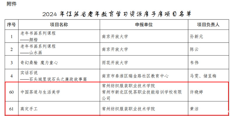 近日,江苏省教育厅公布了2024年省级老年教育学习资源库子库项目认定结果,全省共有64家单位的90个项目脱颖而出,成功上榜。我校再次传来喜讯,创意学院许晓婷、徐静、许婷芳老师携手打造的《中国茶道与生活美学》课程,服装学院黄洁老师主持的《高定手工》课程,双双入选省级老年教育学习资源库子库。这两门特色课程不仅直接入库,还将在“江苏学习在线”与“江苏老年教育”两大学习平台上公开共享,为老年学习者提供丰富的学习资源。这是我校连续两年报送两门课程全部入选获此殊荣。